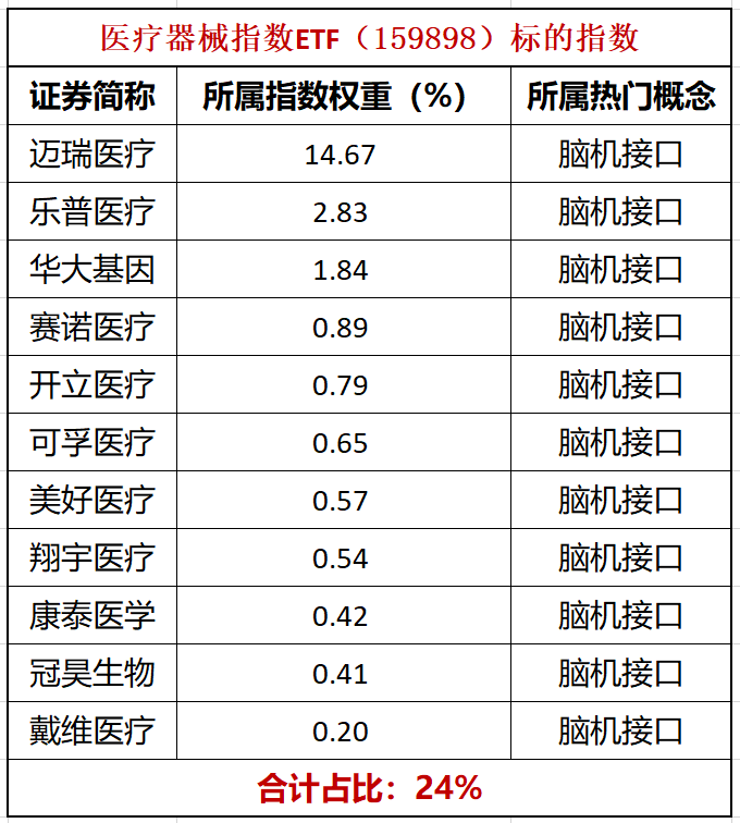 Wind数据显示,医疗器械指数ETF(159898)跟踪中证全指医疗器械指数,按Wind所属热门概念划分“脑机接口概念”含量约24%。该ETF最新规模5.36亿,2025年至今相对指数超额在相同标的ETF中处于领先地位。