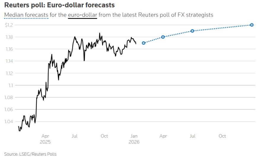在1月5日至7日进行的路透社调查中,外汇预测机构的主流观点几乎未变,均认为美元的下跌趋势将持续。调查中值显示,欧元预计将每季度上涨约1%,在年中兑美元达到1.19,年底达到1.20。在71位参与者中,仅有17%(12位)预测欧元到2026年底会从当前水平走弱。