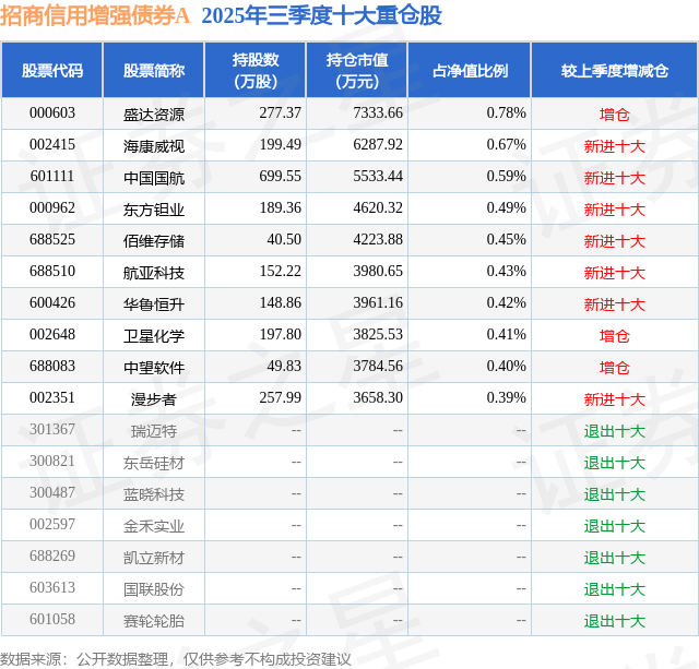 招商信用增强债券A的前十大重仓股如下: