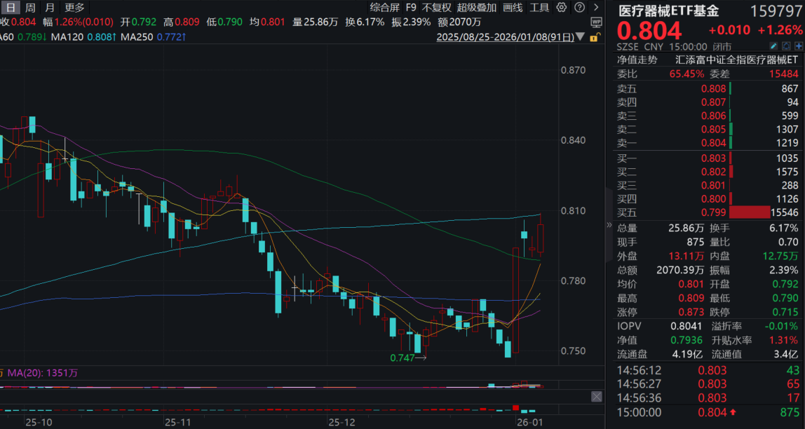 今日(1.8),沪指录得15连阳,脑机接口概念继续大涨,医疗器械板块走强。全市场费率最低档的医疗器械ETF基金(159797)收涨1.26%!资金面上,医疗器械ETF基金(159797)近20日净流入超2700万元!