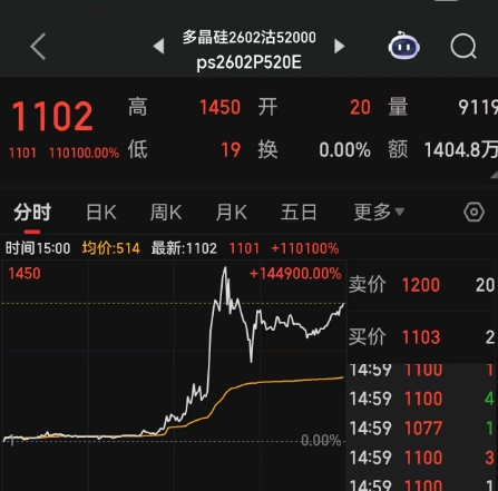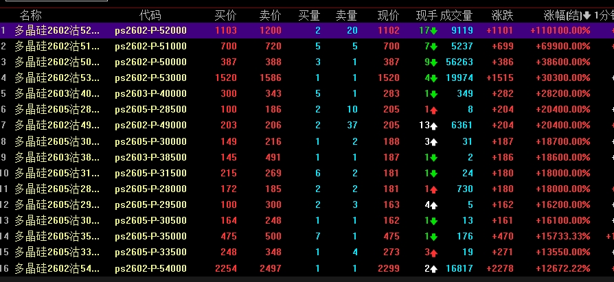 在多晶硅主力期货跌停的同时,多晶硅认沽期权价格暴涨,其中多晶硅2602沽52000收盘报1102,单日暴涨110100%,甚至在同花顺软件中涨幅的位置,110100%数字与涨幅出现了重叠,该合约今天成交了1405万元。