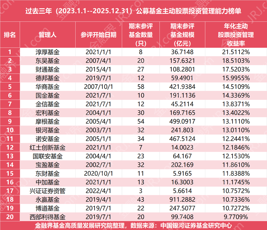 观察近三年数据,主动股票投资管理的年化收益率门槛显著高于十年期,这一区间成为中小型基金公司的“秀场”。榜单数据显示,近三年排名前二十的基金公司中,19家均实现了年化收益率超10%的亮眼成绩。其中,淳厚基金以21.51%的超高年化收益率位居榜首,财通基金、德邦基金等多家中小型机构的年化收益也均突破15%。