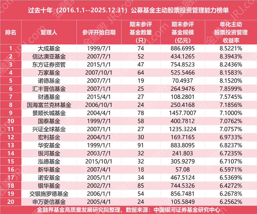 反观成立时间久的老牌基金公司,其核心竞争力则体现在长期业绩的稳定性与持久性上。回顾近十年榜单,主动股票投资管理收益前二十的公司,年化收益率门槛达6.26%,且多数机构的参评历史可追溯至2007年以前,历经多轮牛熊市场的洗礼。老牌公司中,大成基金以8.52%的年化收益率位居榜首,信达澳亚基金年化收益率8.39%,万家基金、诺德基金等年化收益也均超过8%。