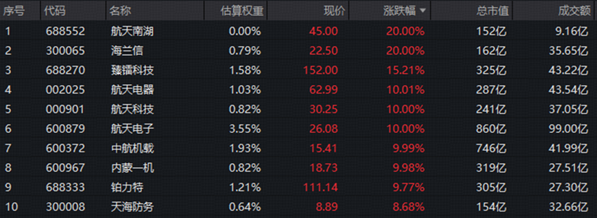 商业航天再起飞,军工股满屏涨停!军工ETF华宝(512810)覆盖的24只商业航天概念股集体冲刺7股涨停,其中航天南湖、海兰信20CM封板!航天发展、中国卫星、中国卫通3股跻身A股成交额前十。