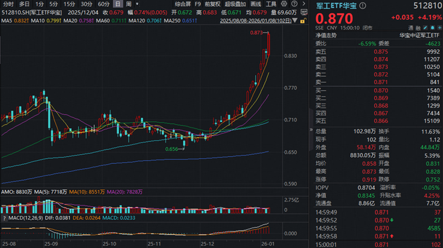 军工ETF华宝(512810)盘中摸高4.55%,放量收涨4.19%,创近半年最大单日升幅,日内价格连续刷新20168月上市以来新高!全天成交8830万元。2025年12月以来,512810K走势尤为陡峭