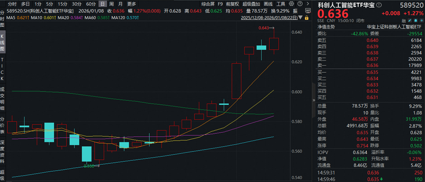 或由于AI 制造重磅政策发布,重点布局国产AI产业链的科创人工智能ETF华宝(589520延续近期上涨态势,场内价格盘中拉升2.39%,收涨1.27%,上探202510月以来的高点,全天成交额4991万元,环比小幅放量。