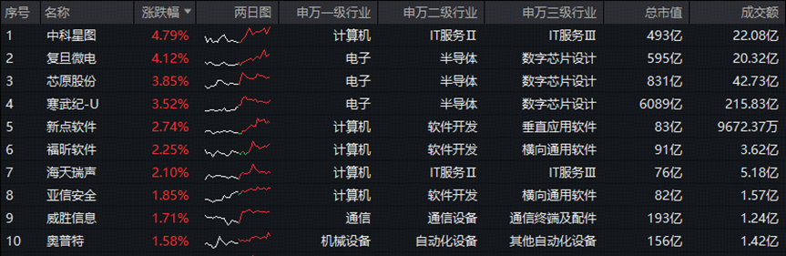 成份股方面,中科星图、复旦微电领涨超4%芯原股份、寒武纪涨逾3%,新点软件、福昕软件、海天瑞声等个股跟涨。值得关注的是,权重股寒武纪全天获主力资金净流入18亿元,跻身A股吸金榜TOP4
