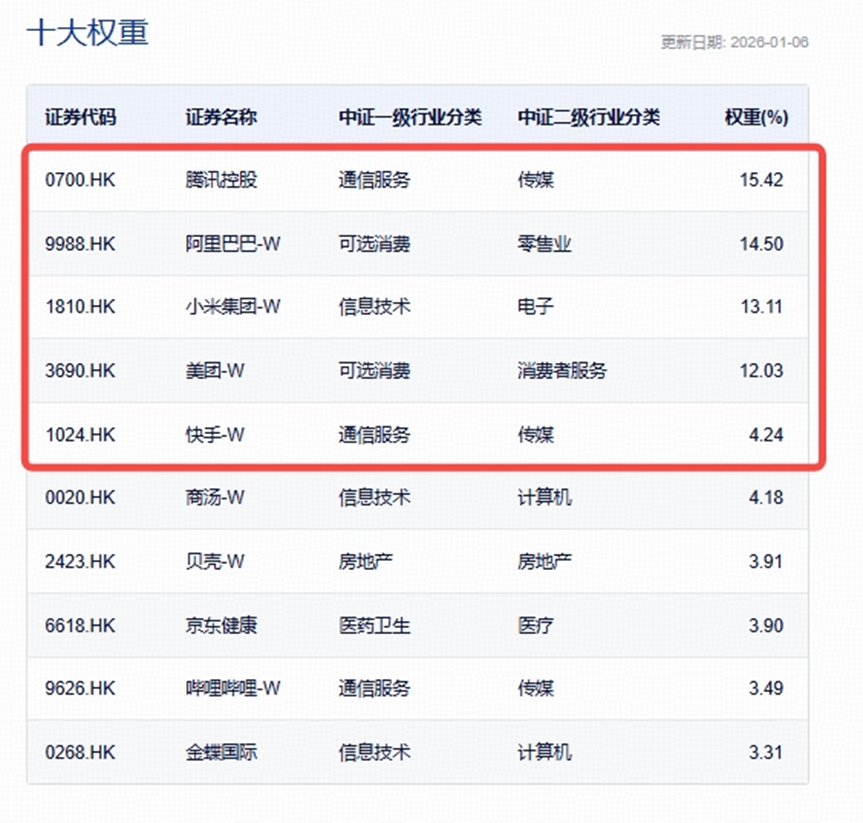港股互联网ETF(513770)及其联接基金(A类017125;C类017126)被动跟踪中证港股通互联网指数,权重股汇聚阿里巴巴-W、腾讯控股、小米集团-W等AI云计算、大模型 各领域AI应用公司,前十大权重股合计占比超78%,龙头优势显著。