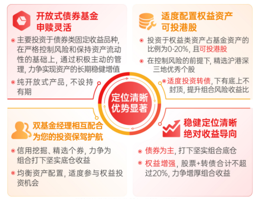 第三,绝对收益导向,定位“稳健”。产品以稳健资产为盾,在严控信用风险的基础上,挑选高性价比的信用债为基本配置,力争提供持续稳定的基础收益。