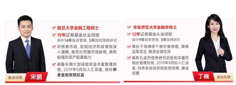 第二,双基金经理护航,实力加倍。汇添富养老金投资部总监宋鹏领衔,联合养老金投资部丁巍共同掌舵,二人均具备丰富的投资管理经验,功底扎实、实力显著,能够实现“1 1>2”的效果。