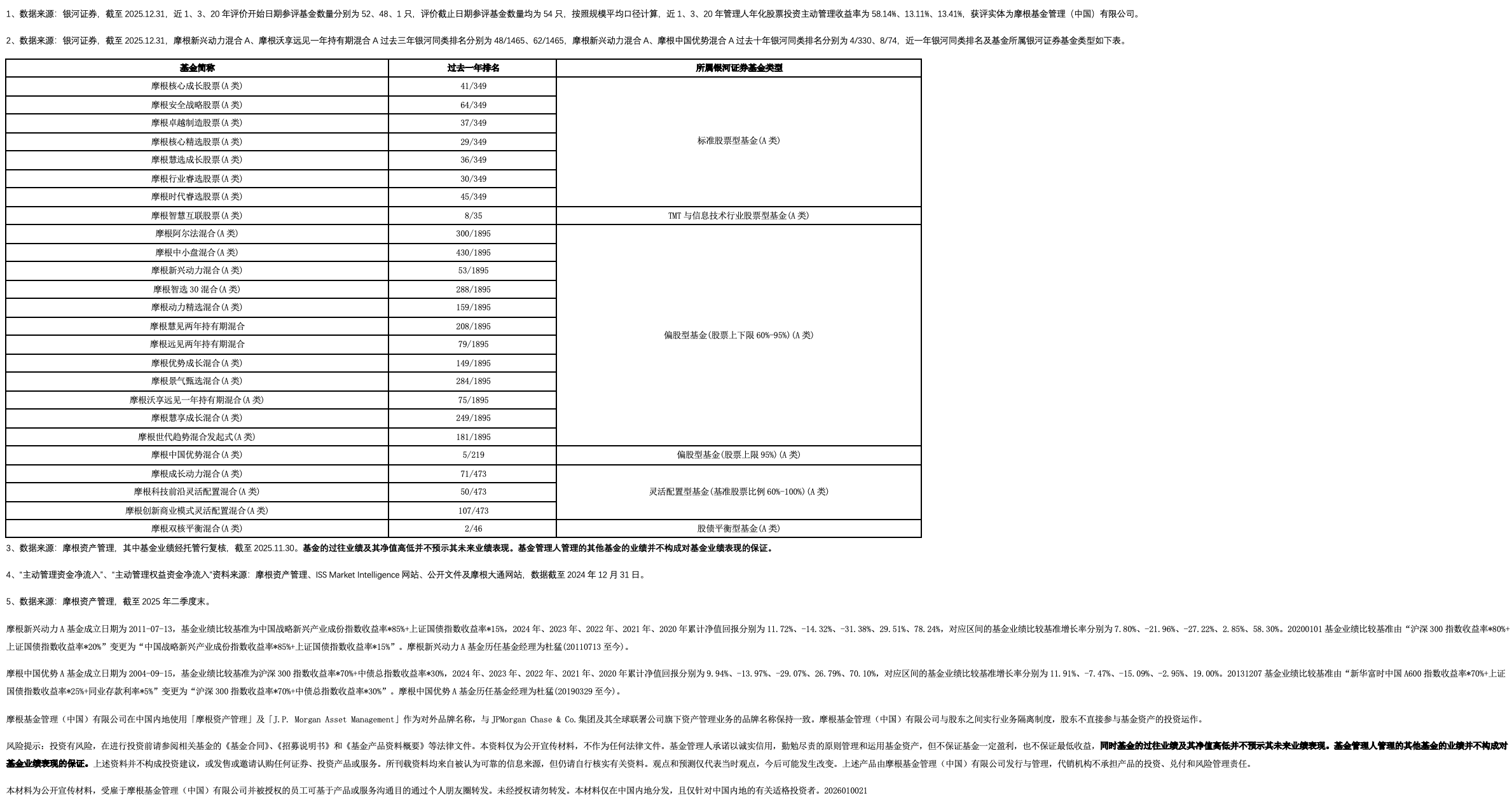 具体产品方面,过去一年,摩根双核平衡混合A、摩根中国优势混合A分别位列同类第2与第5。拉长周期看,过去三年,摩根新兴动力混合A、摩根沃享远见一年持有期混合A等跻身同类前5%;过去十年,摩根新兴动力混合A、摩根中国优势混合A更是分别高居同类第4与第8位2。