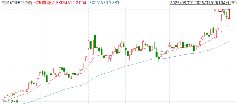 1月9日,有色矿业再度走强,云南锗业、厦门钨业涨停,驰宏锌锗、中钨高新、云南铜业、锡业股份、华锡有色等跟涨。有色矿业ETF招商(159690)涨3.5%,盘中最高价2.145刷新上市以来新高,行情数据显示,该ETF连续10日获资金净申购约7500万元。