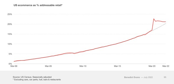 从表中可以看出,电子商务的普及是一个循序渐进而非指数级增长的过程,我们预计人工智能购物代理也将如此。