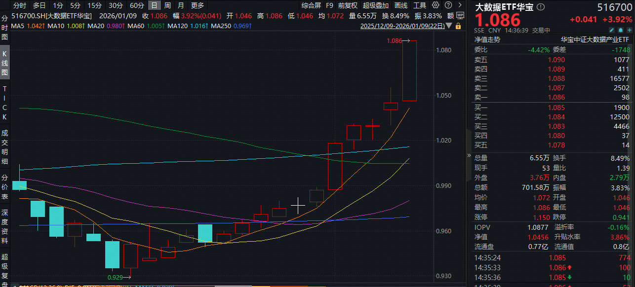 太强了!今日(1月9日),AI应用端大涨,聚焦数据技术、数据安全领域的大数据ETF华宝(516700)场内价格暴拉3.92%,冲击日线11连阳!