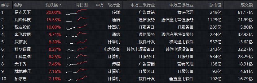 成份股方面,易点天下20CM涨停股价创历史新高!润泽科技涨超15%,税友股份亦涨停,奥飞数据,深信服、科华数据等个股大幅跟涨。