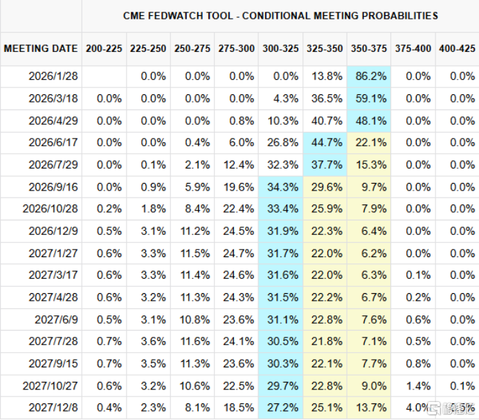 据CME“美联储观察”,美联储1月降息25个基点的概率为13.8%,维持利率不变的概率为86.2%。