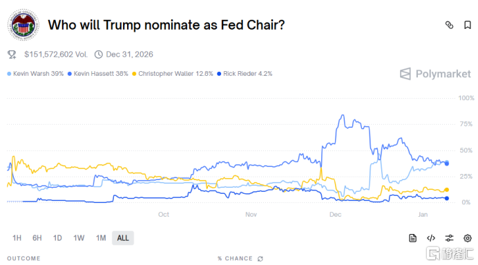 预测市场polymarket显示,目前沃什和哈塞特当选美联储主席的概率最高,分别为39%和38%。