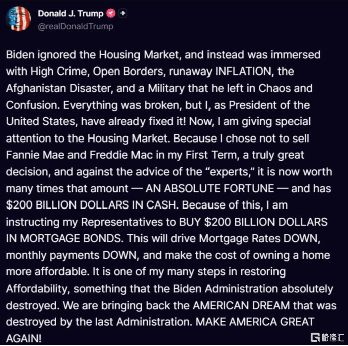 当地时间周四,特朗普在“真实社交”平台宣布,将指示房利美和房地美联合购买2000亿美元抵押贷款债券,以压低房贷利率应对住房可负担性危机。