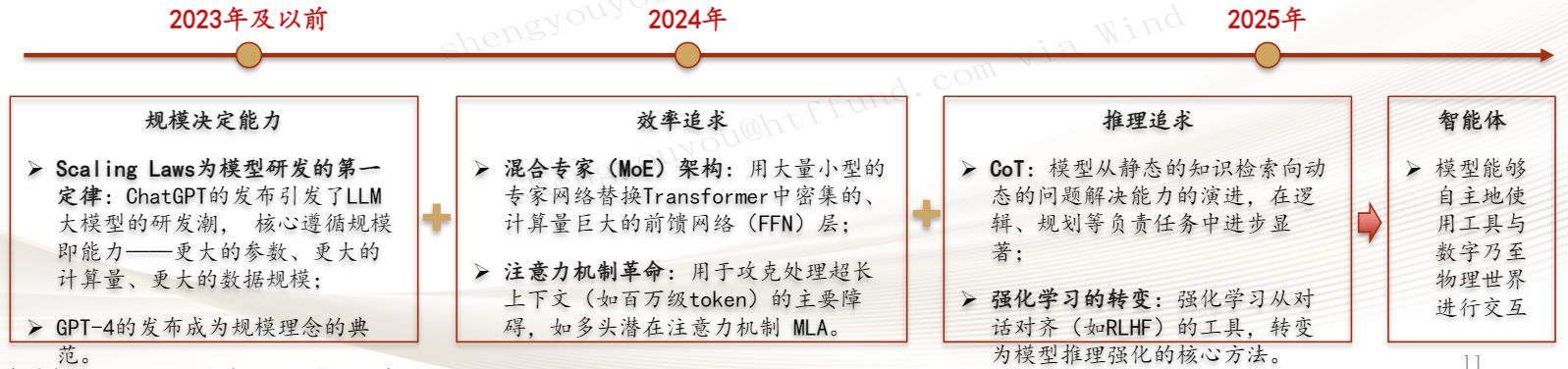 (1)在2023年及以前,LLM的发展遵循“Scaling Laws”,2023年4月GPT 4的成功进一步印证了该路径。