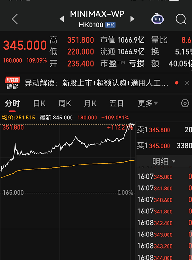 继昨日(1月8日)智谱ai登陆资本市场后,1月9日MiniMax(稀宇科技)正式在港交所主板挂牌上市。区别于智谱的慢热,MiniMax上市首日便轻松翻倍。发行价确定在发行区间上限165港元/股的MiniMax,早盘高开涨超50%,此后震荡走高,截至收盘,大涨109.09%,报345港元/股,总市值约1067亿港元(955.8亿元人民币),今日成交额达40亿港元,
