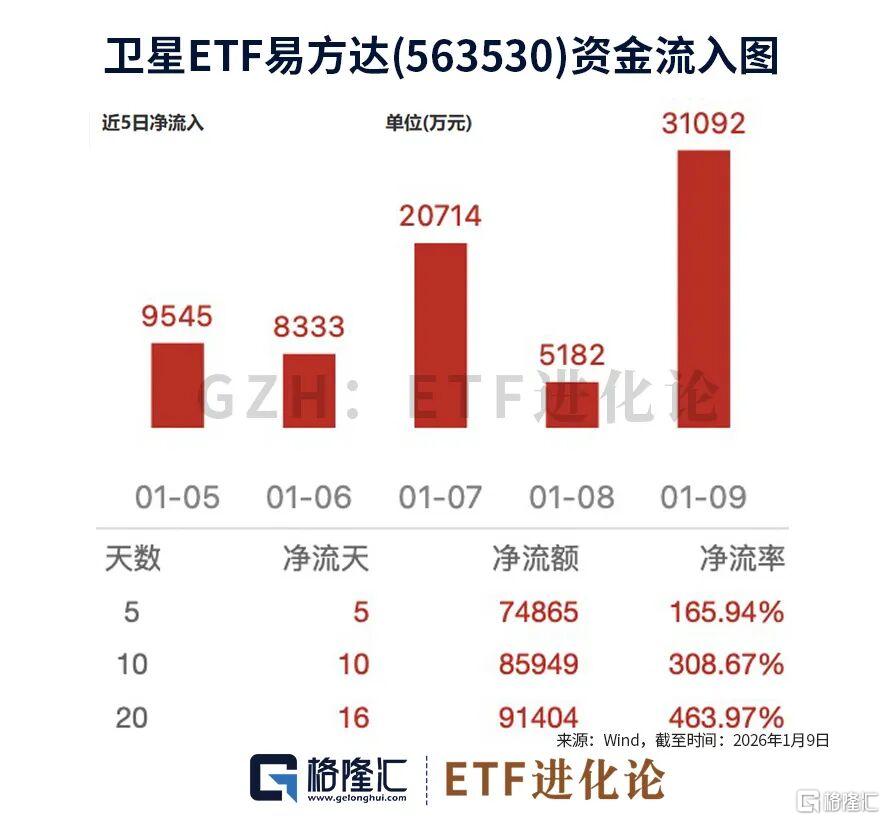 资金更是越涨越买,卫星ETF易方达(563530)33个交易日累计飙涨86.74%,周五单日“吸金”3亿,录得连续10日净申购,合计净流入8.6亿元。