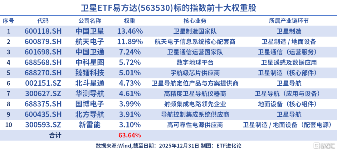 卫星ETF易方达(563530)跟踪中证卫星产业指数,中国卫星、航天电子和中国卫通等前十大权重股覆盖卫星制造、卫星发射、卫星通信、卫星导航、卫星遥感及地面设备等商业航天核心环节,形成“上游核心技术攻关 中游规模化组网 下游应用落地”的立体化投资矩阵。