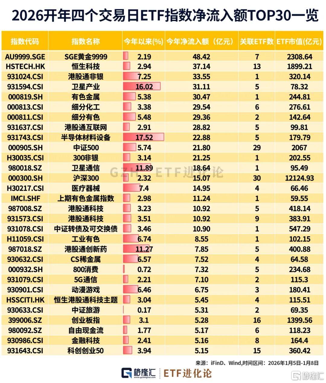 在特朗普炸出2026年首只黑天鹅后,国际金价续攀新高,SGE黄金9999成为“吸金”第一的ETF指数,紧随其后的恒生科技、港股通非银、卫星产业和有色金属同样是“越涨越吸金”