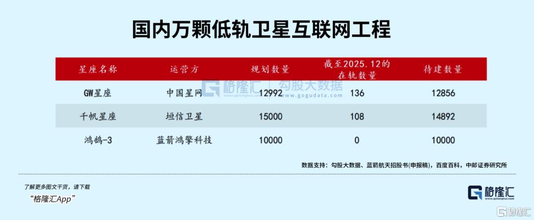 目前,我国商业航天星座布局已初步形成三大万颗级计划,分别是中国星网的GW星座、上海垣信的G60千帆星座,以及蓝箭鸿擎科技的鸿鹄-3星座。