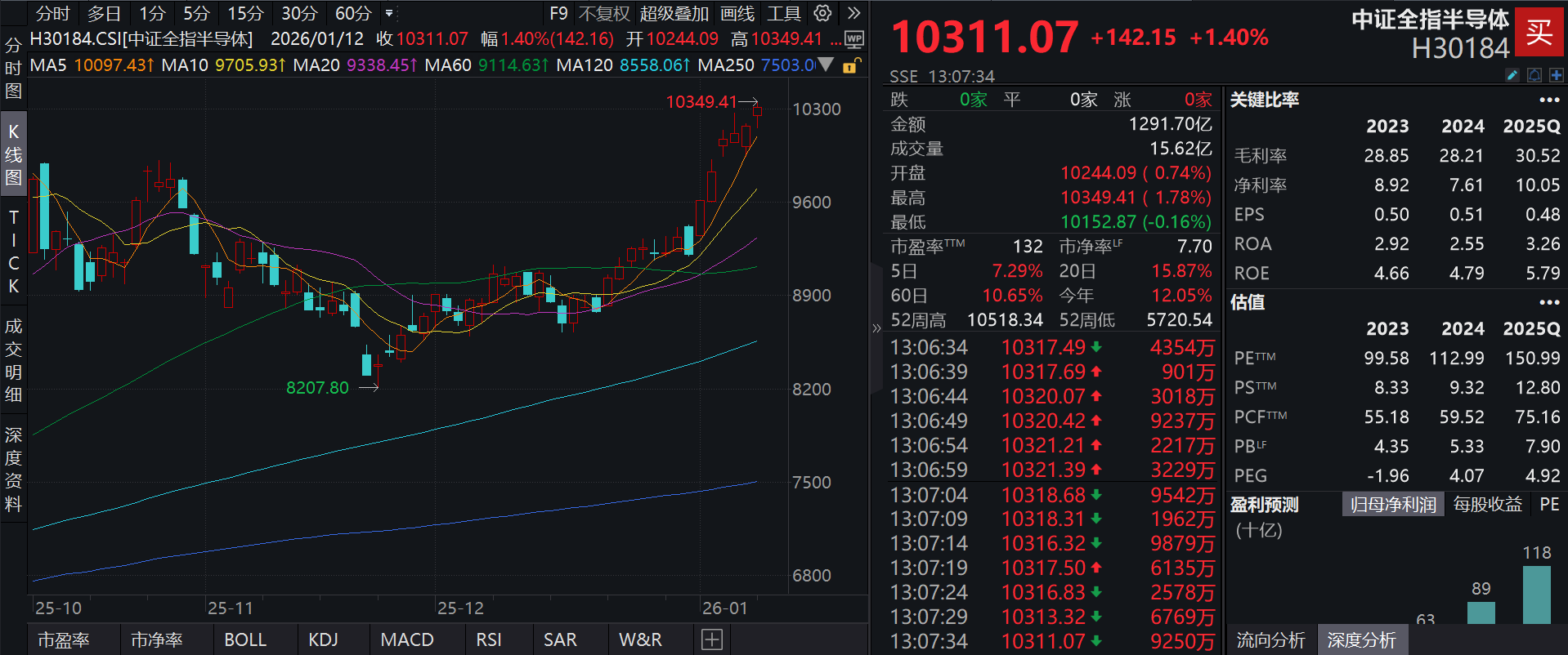 今日(1月12日),AI应用概念领涨市场,半导体板块活跃上行!中证全指半导体指数一度涨近2%,现涨1.40%,相关个股电科芯片涨停,龙芯中科涨超16%,唯捷创芯、复旦微电、恒玄科技等个跟涨。
