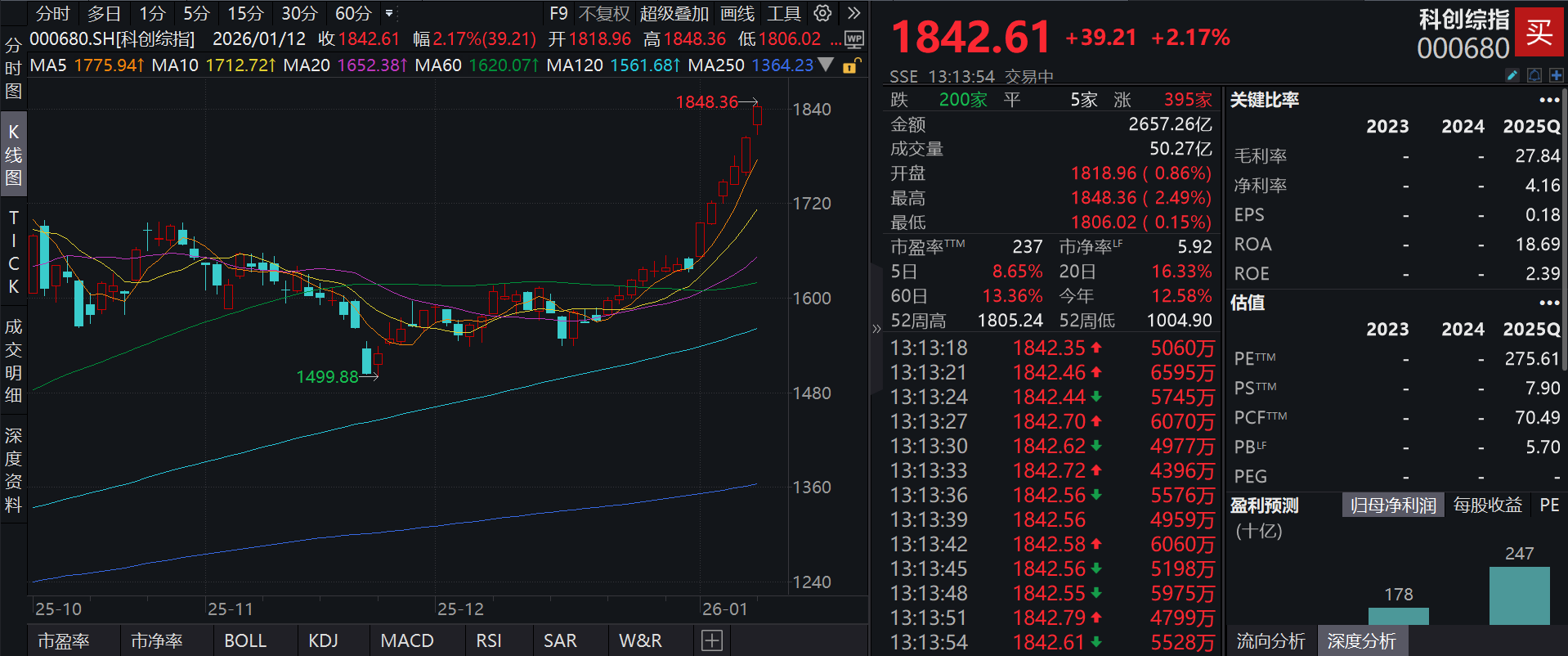 截至2026年1月12日 13:13,科创综指(000680)强势上涨2.17%,成分股普元信息(688118)上涨20.01%,信科移动(688387)上涨20.01%,新点软件(688232)上涨20.01%,康众医疗(688607),光云科技(688365)等个股跟涨。