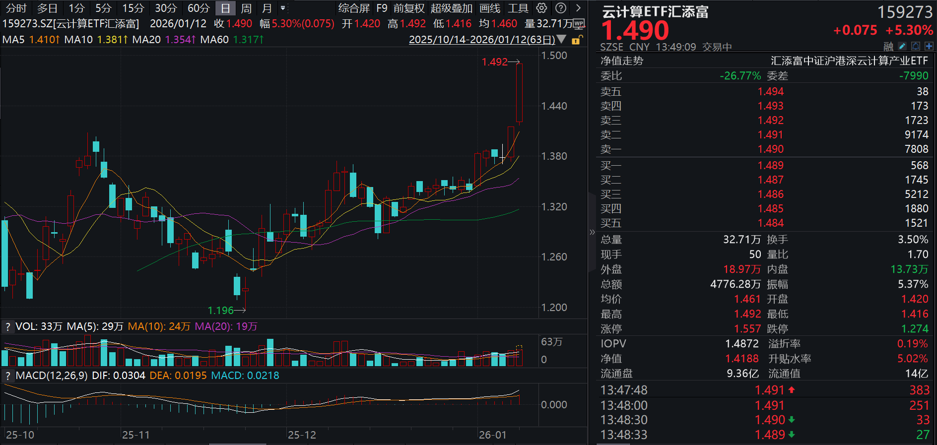 今日(1.12),AI算力板块再度强势,云计算ETF汇添富(159273)放量大涨5.3%,盘中成交额5000万元,超过上一交易日全天!