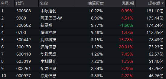 云计算ETF汇添富(159273)标的指数权重股多数飘红:汉得信息、拓尔思20CM涨停,润泽科技涨超15%,华胜天成涨超7%,阿里巴巴-W涨超4%,拓维信息涨超3%,浪潮信息涨超2%。