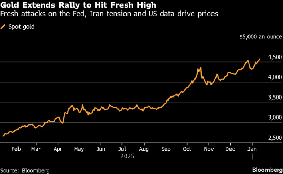 美国司法部威胁要对美联储提起刑事诉讼,再度引发市场对美联储独立性的担忧,同时伊朗境内的抗议活动提振避险需求,受此影响,黄金与白银价格双双创下历史新高。