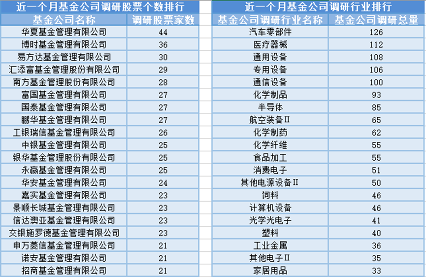 近一个月(12月13日-1月12日),华夏基金参与公司调研的数量最多,共调研44家上市公司,此外调研较为活跃的还有博时基金、易方达基金和汇添富基金,分别调研36家、30家、29家上市公司;从调研行业上来看,基金公司对汽车零部件行业的上市公司调研次数最多,共有126次,其次是医疗器械行业,基金公司调研了112次。
