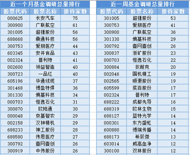 将时间周期缩短到最近一周(1月5日-1月12日)来看,基金调研数量第一的公司是超捷股份,超捷股份属于汽车零部件行业,主营业务为高强度精密紧固件、异形连接件等产品的研发、生产与销售。超捷股份共被53家基金机构调研,其次被调研数量较多的股票是爱朋医疗、广联航空和熵基科技,分别接受41家、36家和29家基金机构的调研。