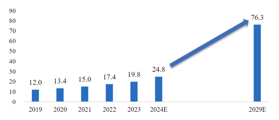 据 Grand View Research 统计,市场规模从2019年的12亿美元增长至2023年的近20亿美元,期间复合增长率超过13%。 展望未来,该机构预测行业将进入高速增长阶段,预计从2024年至2029年的复合增长率将达到25.2%,到2029年全球产业规模有望增至76.3亿美元