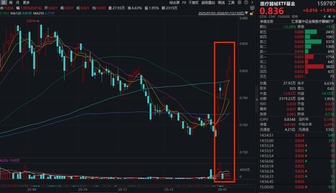今日(1.12),沪指录得17连阳,脑机接口概念继续飙升,医疗器械板块走强。全市场费率最低档的医疗器械ETF基金(159797)收涨1.95%强势三连阳!资金面上,医疗器械ETF基金(159797)全天再获净申购1000万份