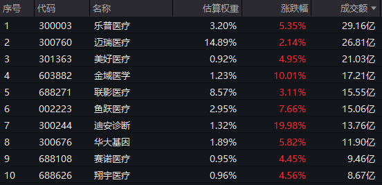 截至收盘,医疗器械ETF基金(159797)标的指数成分股多数收红:迪安诊断20CM涨停,金域医学10CM涨停,鱼跃医疗涨超7%,乐普医疗、华大基因涨超5%,美好医疗涨近5%,联影医疗涨超3%,迈瑞医疗涨超2%。