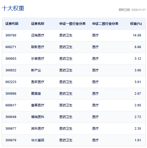 政策重磅支持,AI 医疗风起,医疗器械ETF基金(159797)既有医药属性又有高端制造属性!全面覆盖医疗设备、体外诊断、高值耗材、低值耗材等医疗器械核心领域。截至2026年1月7日,医疗器械ETF基金(159797)前十大权重股占比45.04%!