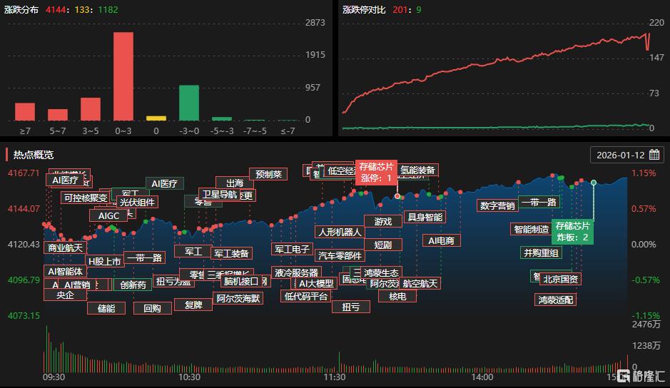 1月12日,沪指涨1.09%报4165点,录得17连阳。全市场成交额达3.64万亿元创历史新高,超4100股上涨。市场热点聚焦AI应用、商业航天、卫星互联网板块。