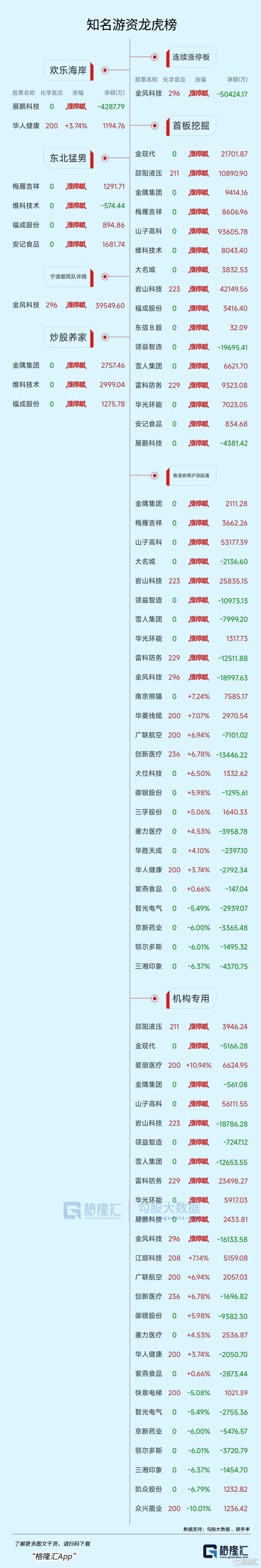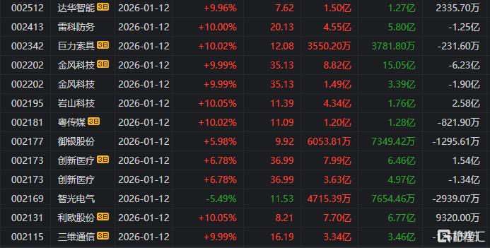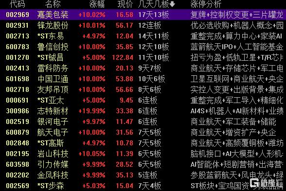 高位股方面,实控人变更的嘉美包装17天13板、锋龙股份12连板,商业航天概念股鲁信创投12天10板、雷科防务9天7板、金风科技11天7板,AI应用端的志特新材20CM6连板。