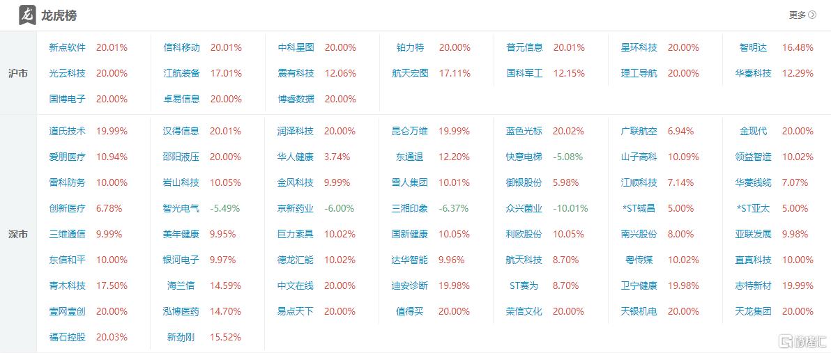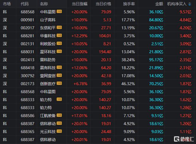龙虎榜中涉及机构专用席位的个股中,当日净买入额前三为山子高科、雷科防务、信科移动,分别为4.84亿元、2.35亿元、1.07亿元。