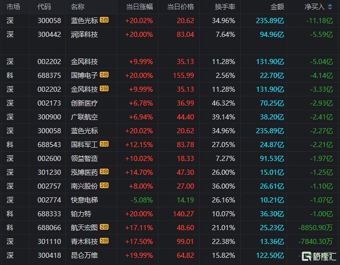 龙虎榜单日净卖出额前三为润泽科技、金风科技、创新医疗,分别为5.59亿元、5.04亿元、2.93亿元。