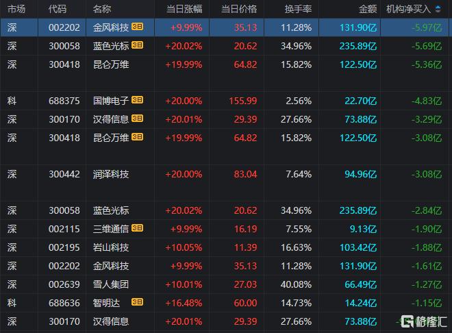 龙虎榜中涉及机构专用席位的个股中,当日净卖出额前三为昆仑万维、润泽科技、蓝色光标,分别为5.36亿元、3.08亿元、2.84亿元。