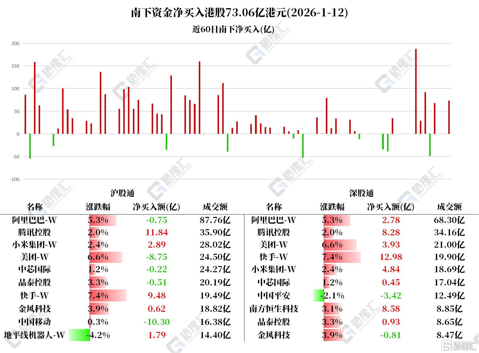 12、南下资金大幅净买入快手和腾讯,连续多日净卖出中国移动;