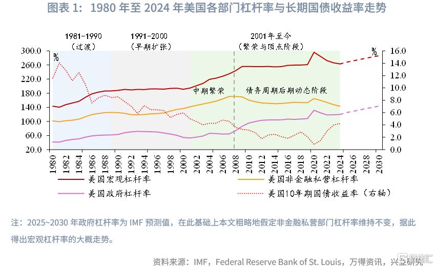 本文将美国主导的全球第三轮债务周期划分为以下四个阶段:1980年至1990年(新旧周期过渡阶段)、1991年至2000年(早期扩张阶段)、2001年至今(繁荣与顶点阶段)。基于Dalio对当前债务周期的判断,我们可将2001年至2008年划分为中期繁荣阶段,其主要特征是信贷扩张加速与资产价格泡沫的同步上升。2008年金融危机至今,进入债务周期的“后期动态(late-cycle dynamics)”阶段。这一阶段的核心特征在于去杠杆与再杠杆并存、货币政策边际效力下降,财政与货币政策一体化,以及高债务、高通胀与社会分裂并行,债务周期已逐渐逼近顶点。因此,本文将2001年至今的繁荣与顶点进一步划分为两个小节进行讨论:其一为“中期繁荣阶段”,其二“后期动态阶段”。