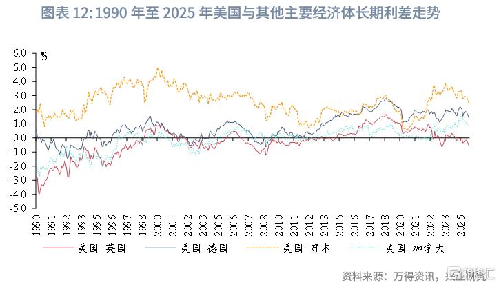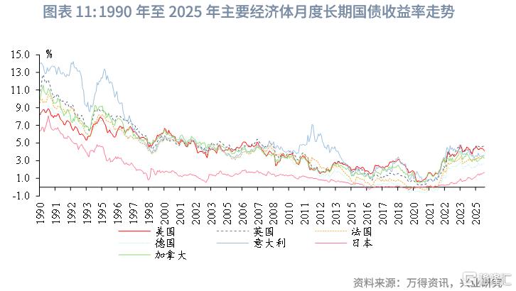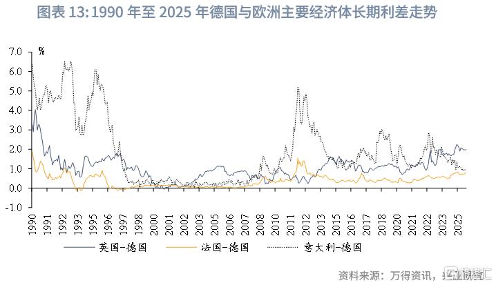 1980年代中后期,在通胀预期锚定后,美国长期利率中枢开始下移;相比之下,德国因市场深度与流动性不及美国、期限溢价更高,其长期利率略高于美国。法国、加拿大、意大利与英国的长期利率则普遍高于德国,反映出各自通胀预期与财政状况的差异。这种“美国为全球锚、德国为欧洲锚”的格局一直延续到1990年代欧元体系逐步成形。在欧盟框架确立后,欧洲内部利差收敛,全球利率体系的层级结构被重新塑造。