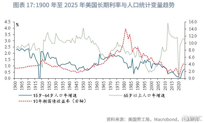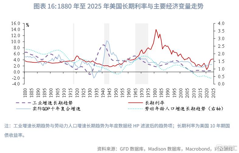 以英国主导的第一轮债务周期来看,长期利率整体可控且在后期保持相对平稳,主要源于两方面因素:其一是制度优势的支撑,使得英国国债成为了全球稀缺的安全资产;其二是人口增速与工业增速逐渐走平,同时通缩预期较强,共同压低了利率中枢。