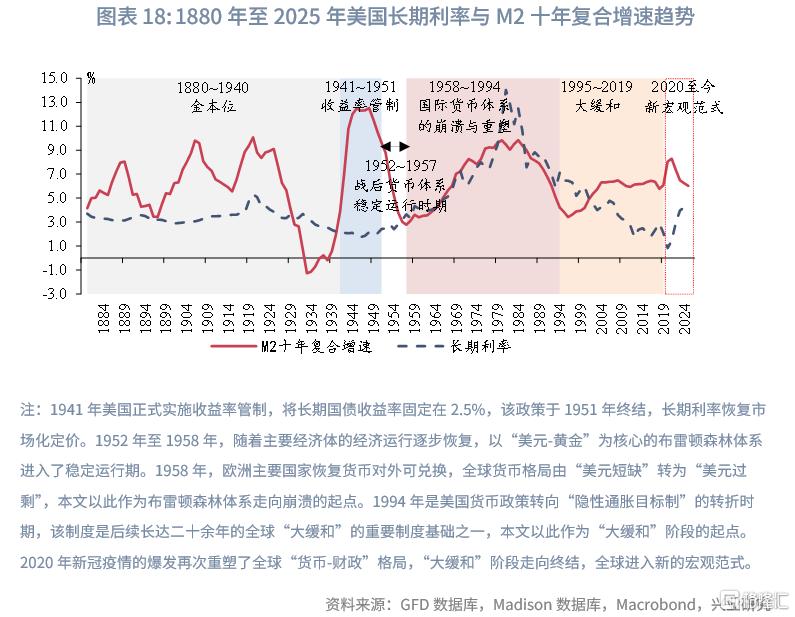 从历史视角看,货币增速与长期利率的关系并不稳定,其联动性随全球货币制度的更迭而呈现出鲜明的阶段性特征。1940年以前,主要经济体皆为金本位制,货币供给主要取决于黄金储备变化,而长期利率则由通胀与实际利率决定。二者的决定机制关联性较弱,进而导致相关性整体较弱。1941年至1951年,美国政府实施收益率管制,将名义长期利率锁定在低位,而战时财政扩张又推高了货币增速,造成了货币数量与利率完全脱节的极端情形。随后美国退出收益率管制,货币增速也显著下降。