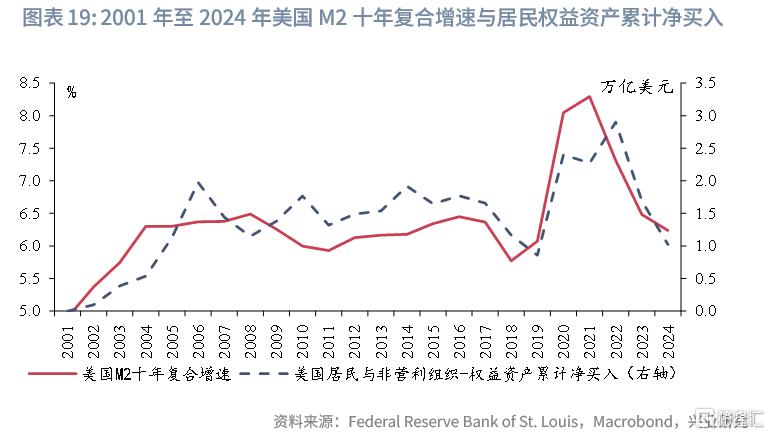 1958年后,布雷顿森林体系稳定性开始削弱,黄金持续外流,货币扩张大幅突破黄金约束,货币增速与长期利率之间的结构性关联开始显现:货币扩张更直接地影响通胀预期和名义利率,二者的走势开始呈现同步性。1970年代后期,通胀预期急剧脱锚使得长期利率一度大幅突破货币增速,形成名义利率“超调”。1980年代至1990年代初期,随着通胀重新锚定,名义利率回落并再度与货币扩张保持大体一致的走势。1994年后,货币增速与长期利率之间的相关性再度弱化。一方面,金融创新与资本市场深化吸收了大量超发货币;另一方面,人口老龄化与全球储蓄过剩持续压低自然利率。二者共同削弱了货币数量对利率变动的解释力。大量研究指出,在利率长期下行与金融中介风险承载能力提升的环境下,新增货币往往难以流入实体经济,而是更倾向进入股票、债券等资产(Gagnon et al., 2011;Miranda-Agrippino & Rey, 2020;Borio,2014)。从美国居民与非营利组织部门的资产流量亦可观察到相同规律:其权益资产净买入与M2增速长期趋势高度同步,股票市场事实上已成为21世纪最主要的流动性蓄水池。